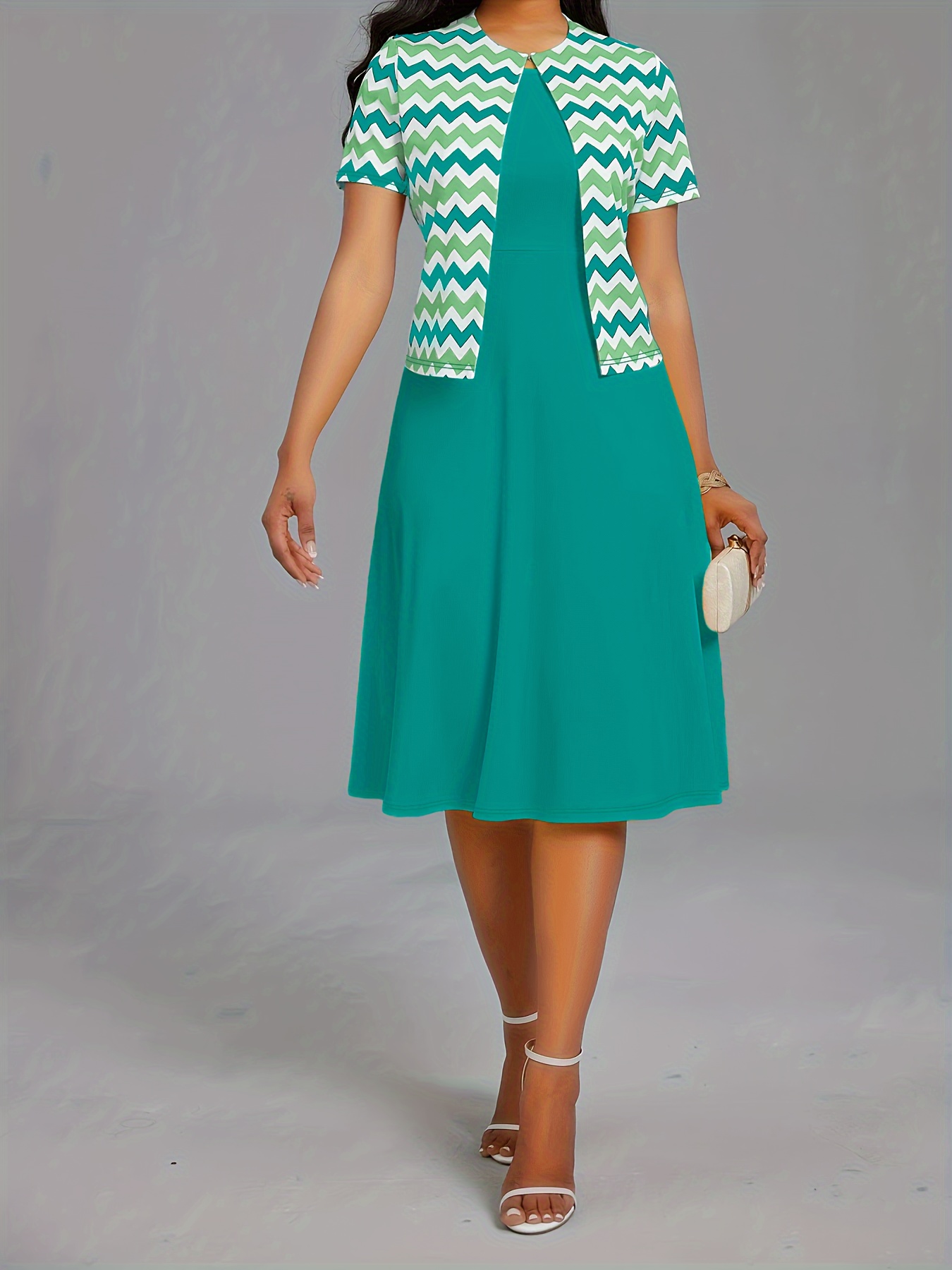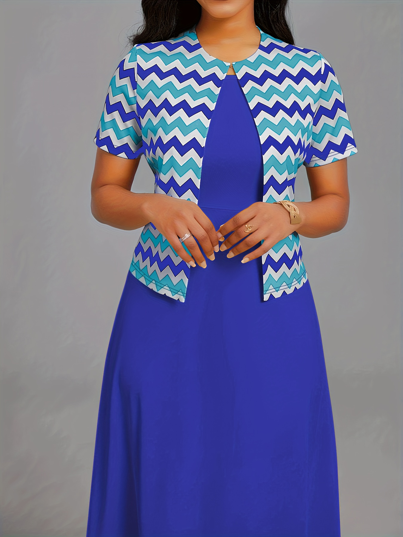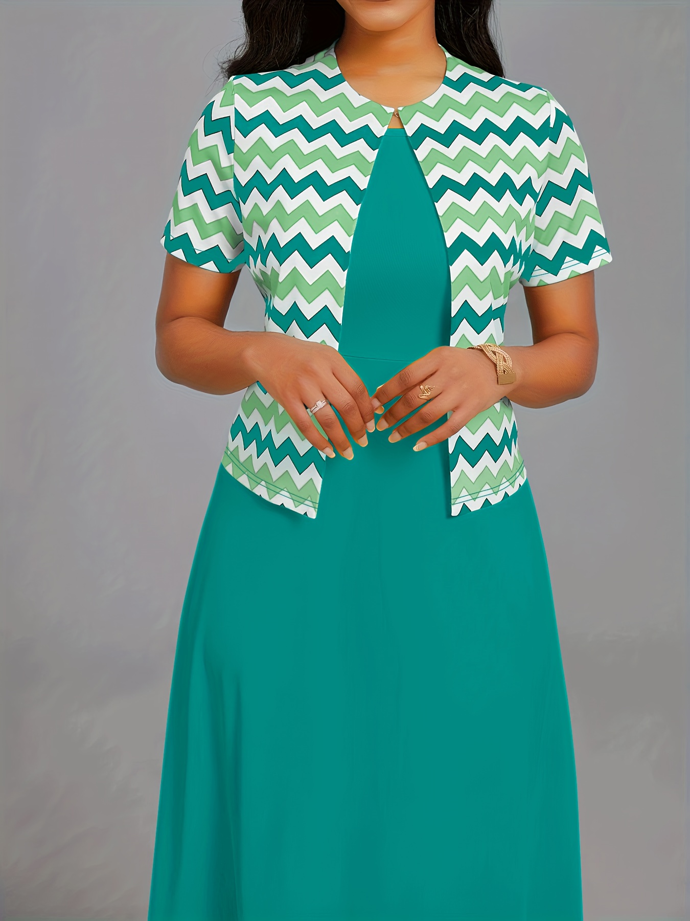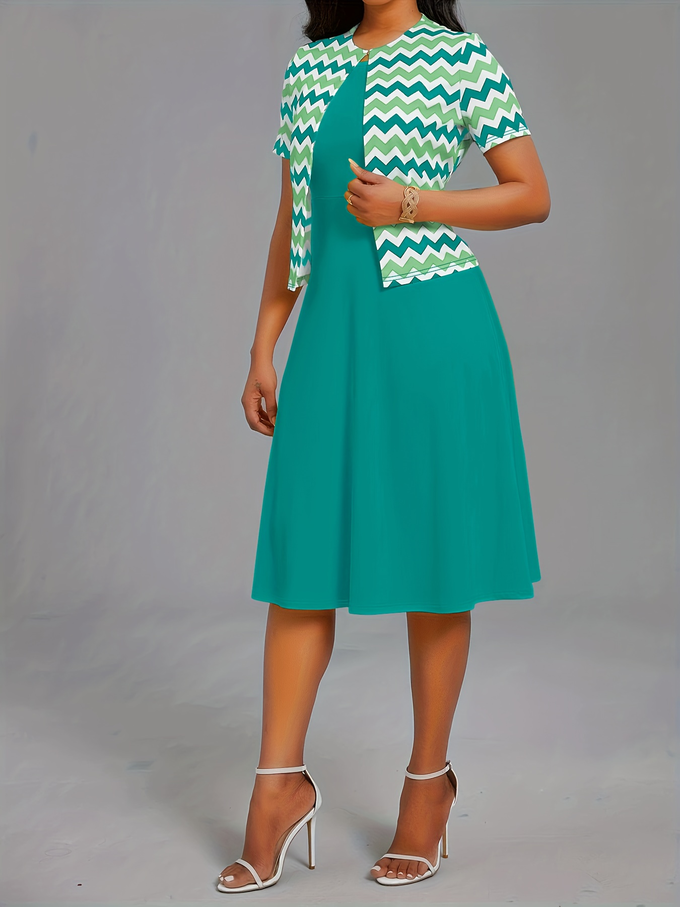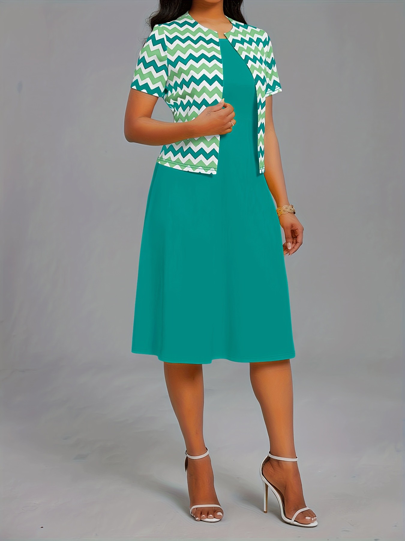 Chic Spring & Summer Dress Set - Stylish Wave Pattern Open Front Cardigan & Soft Solid Color Crew Neck Dress Outfit - Perfect for Casual Elegance