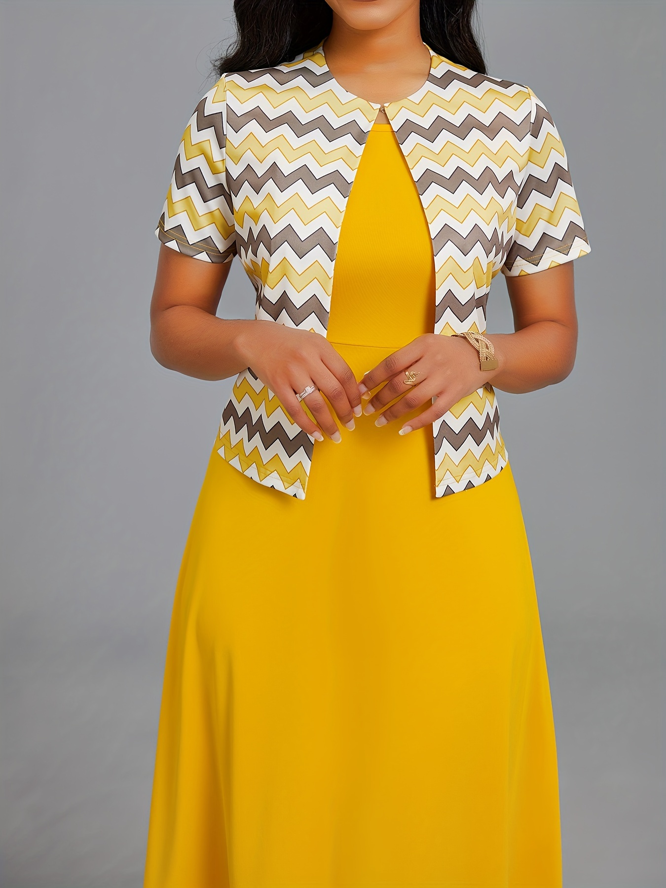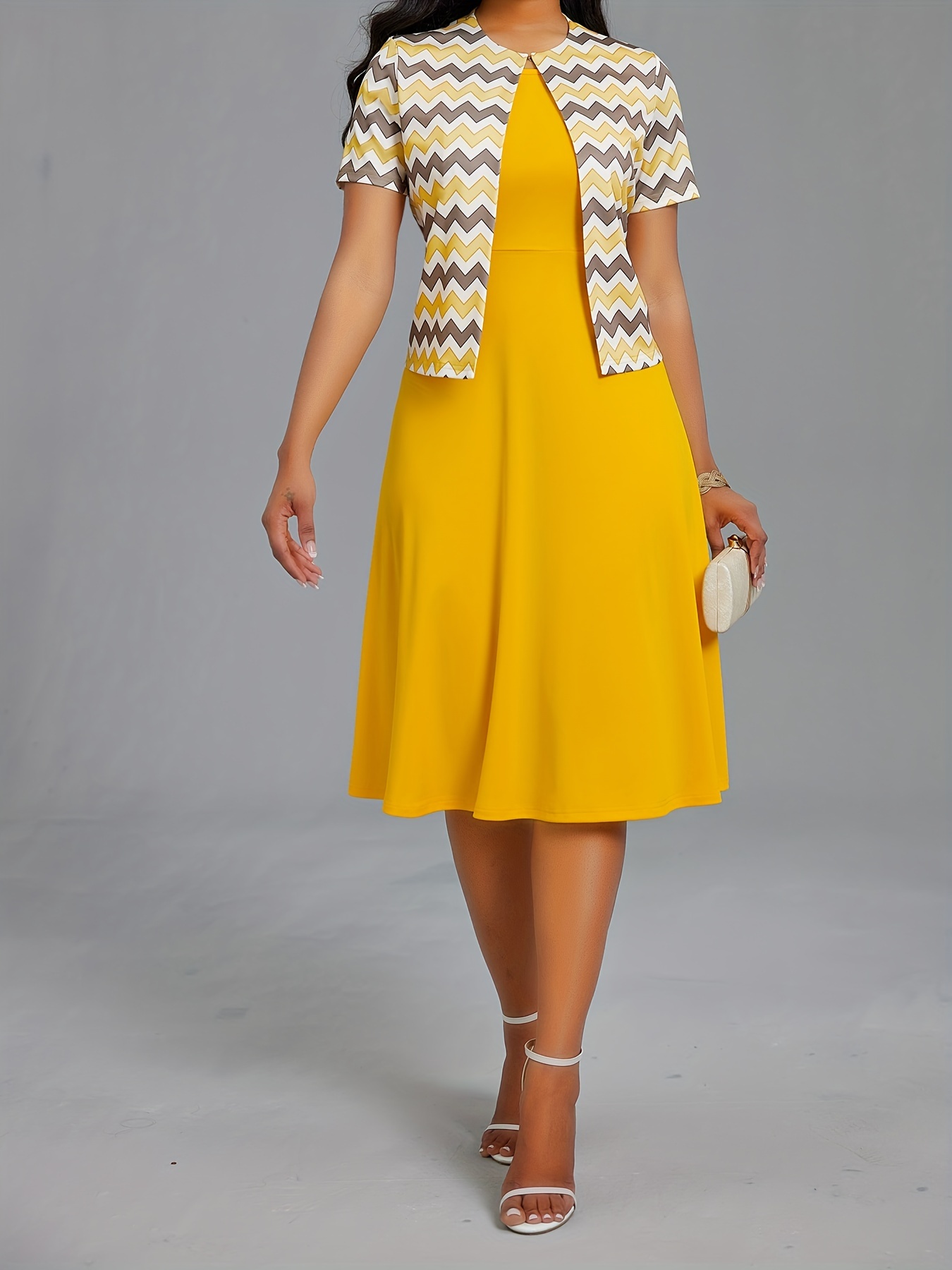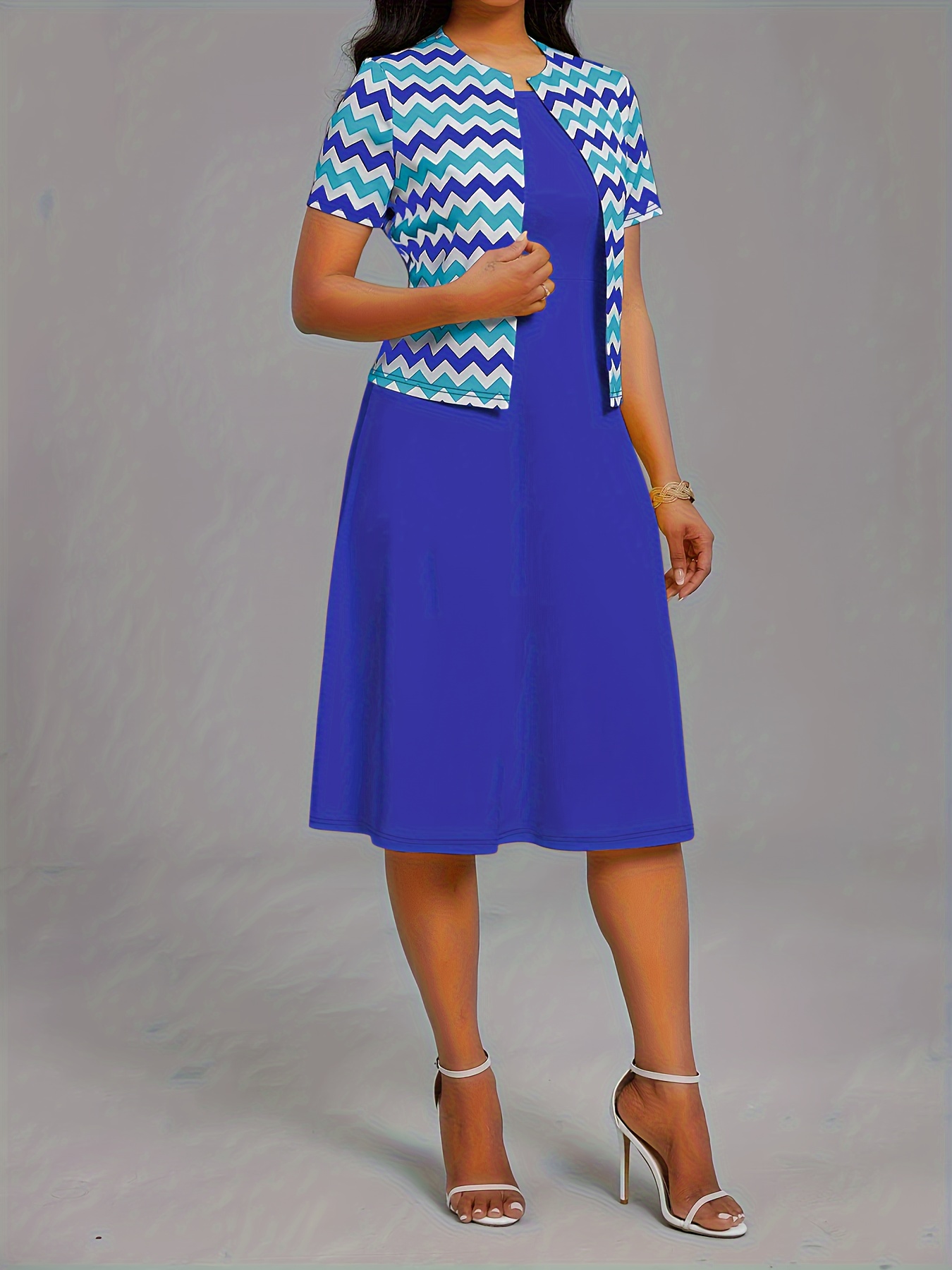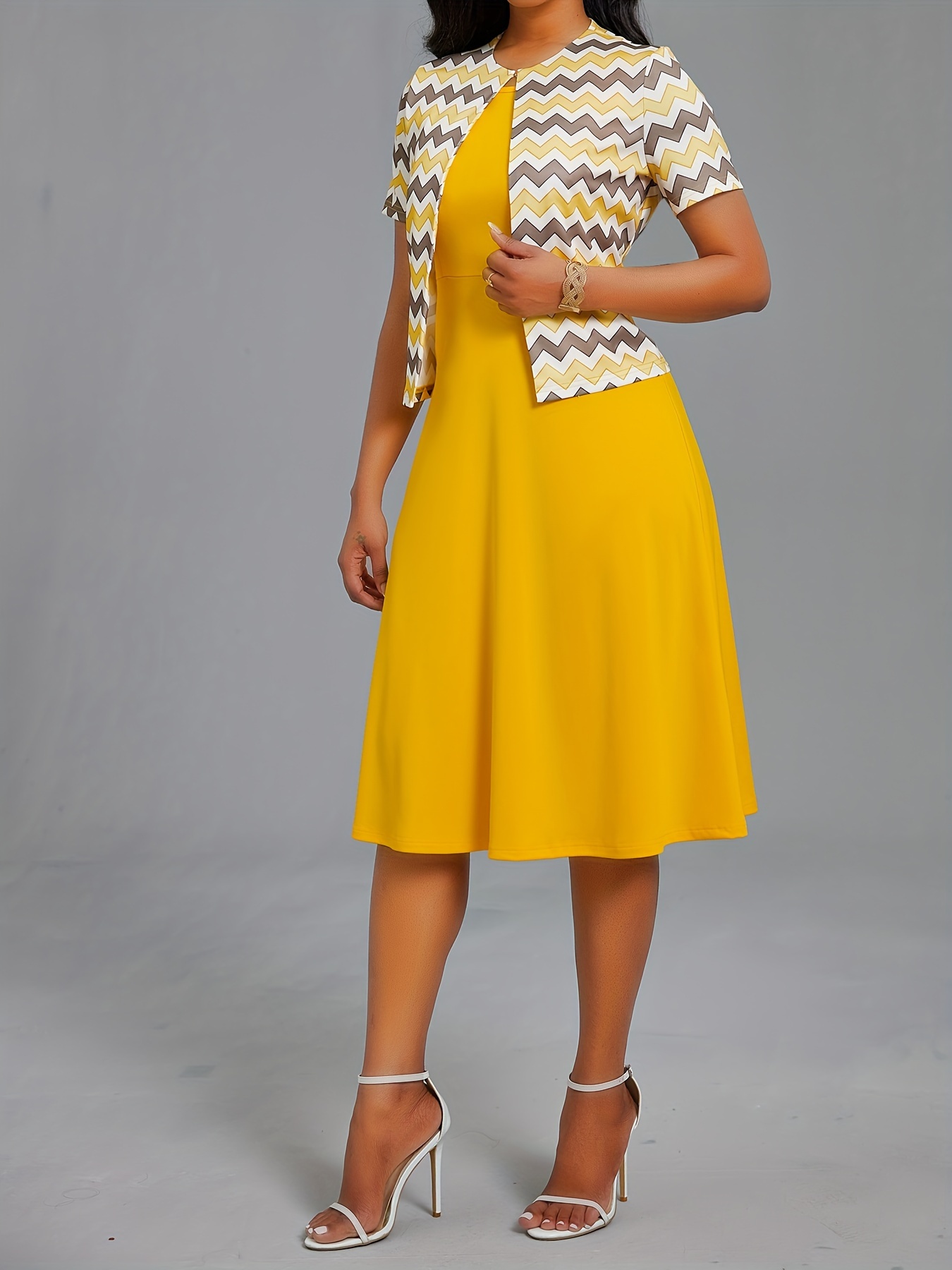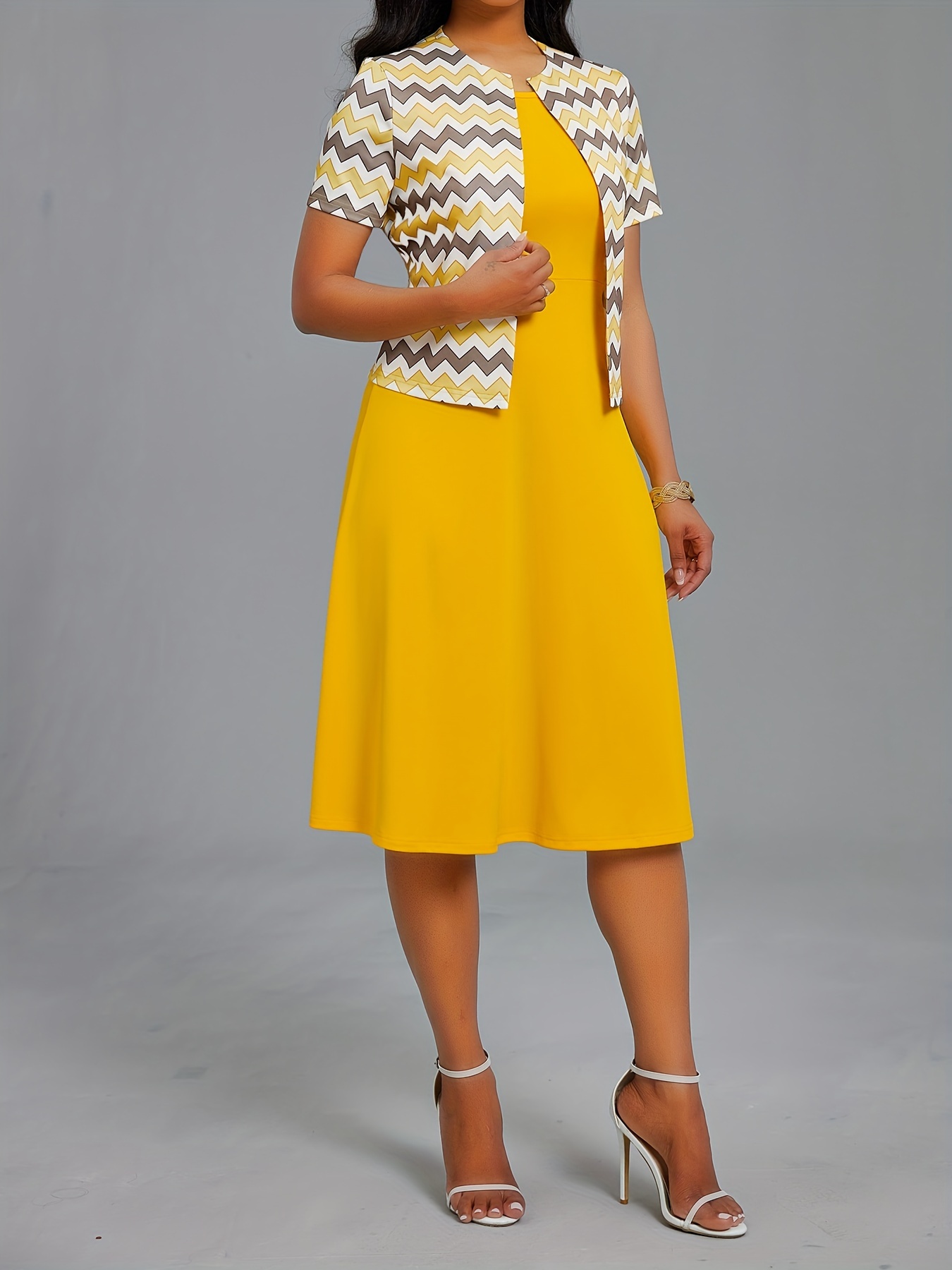 Chic Spring & Summer Dress Set - Stylish Wave Pattern Open Front Cardigan & Soft Solid Color Crew Neck Dress Outfit - Perfect for Casual Elegance