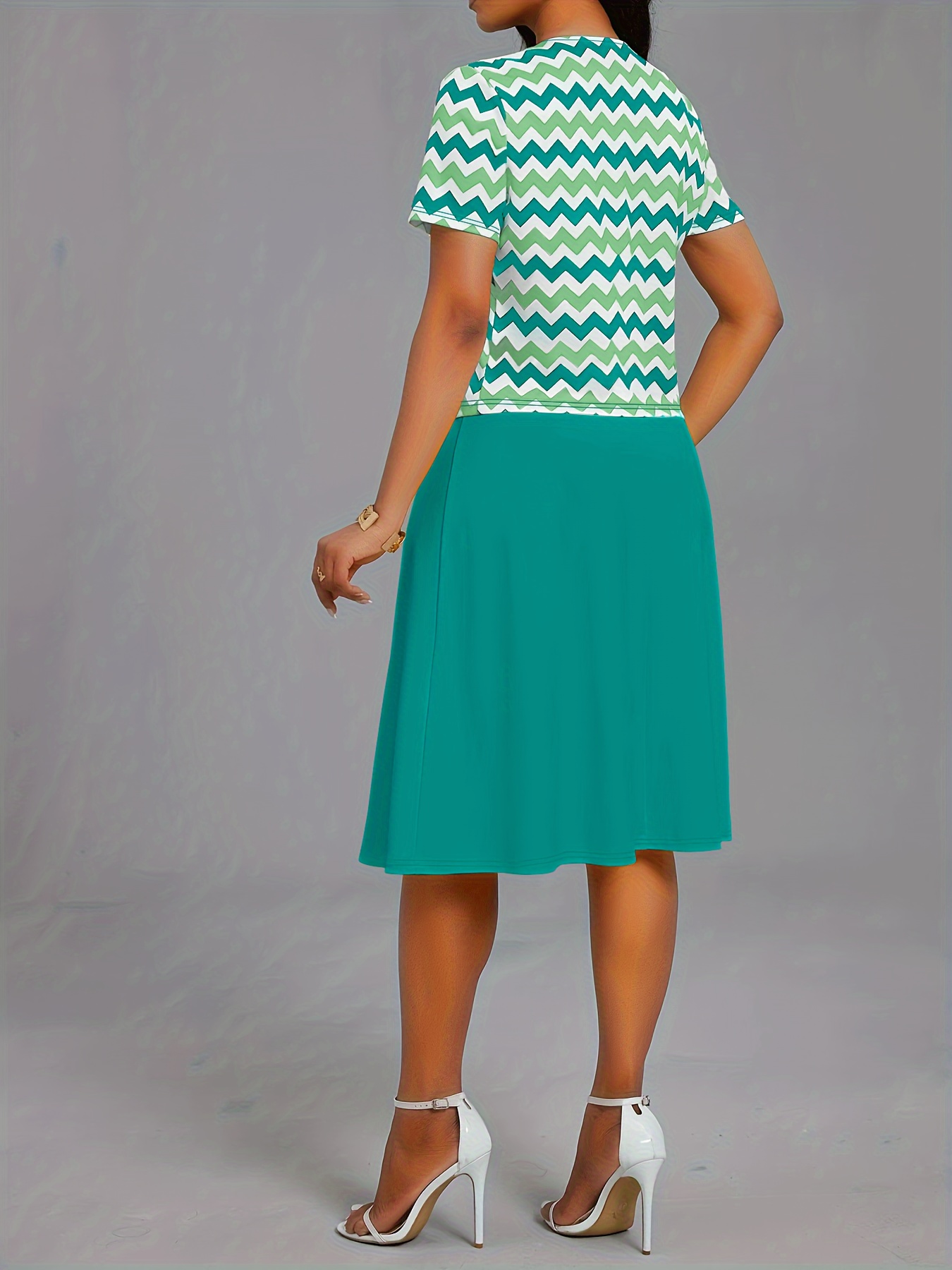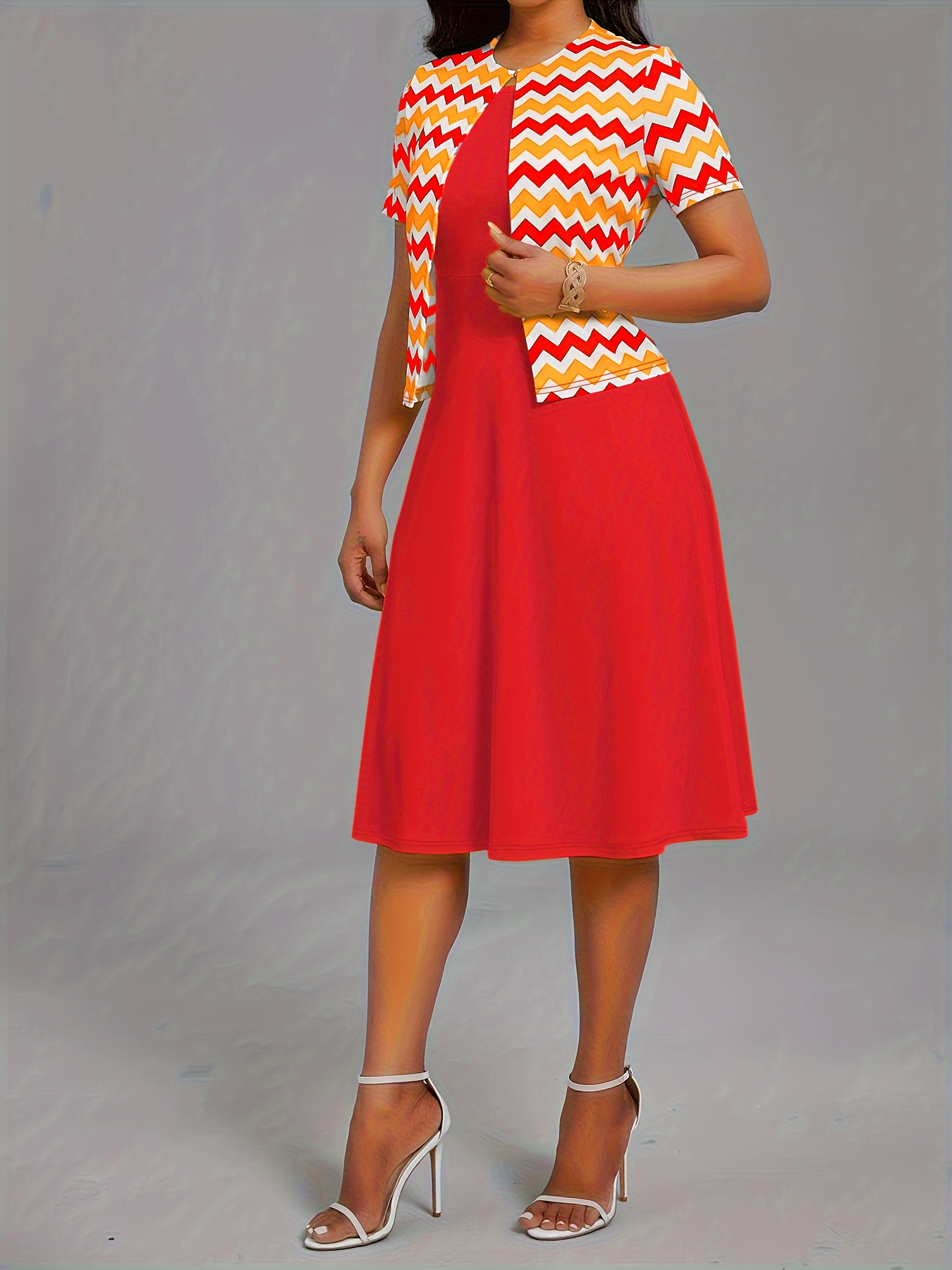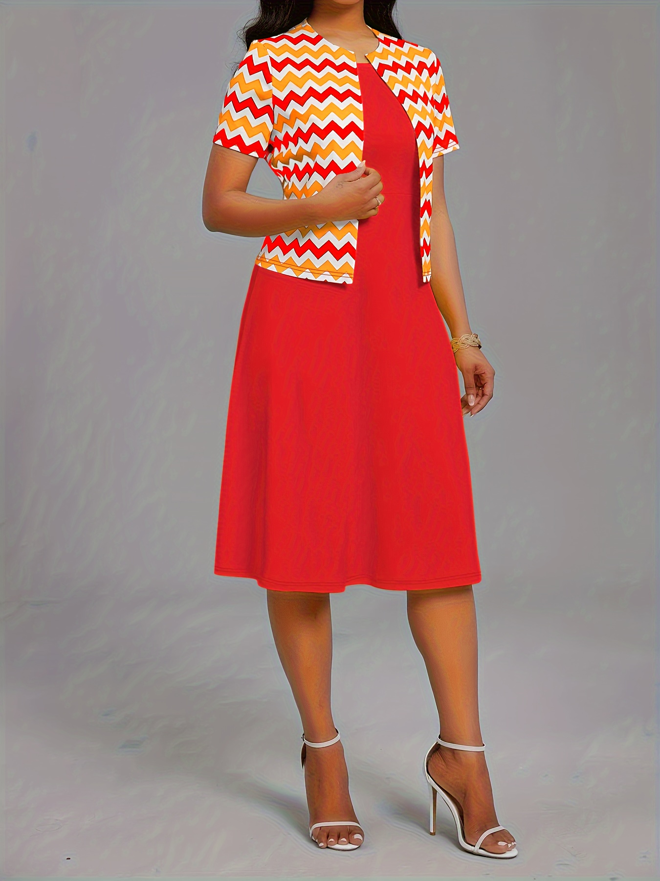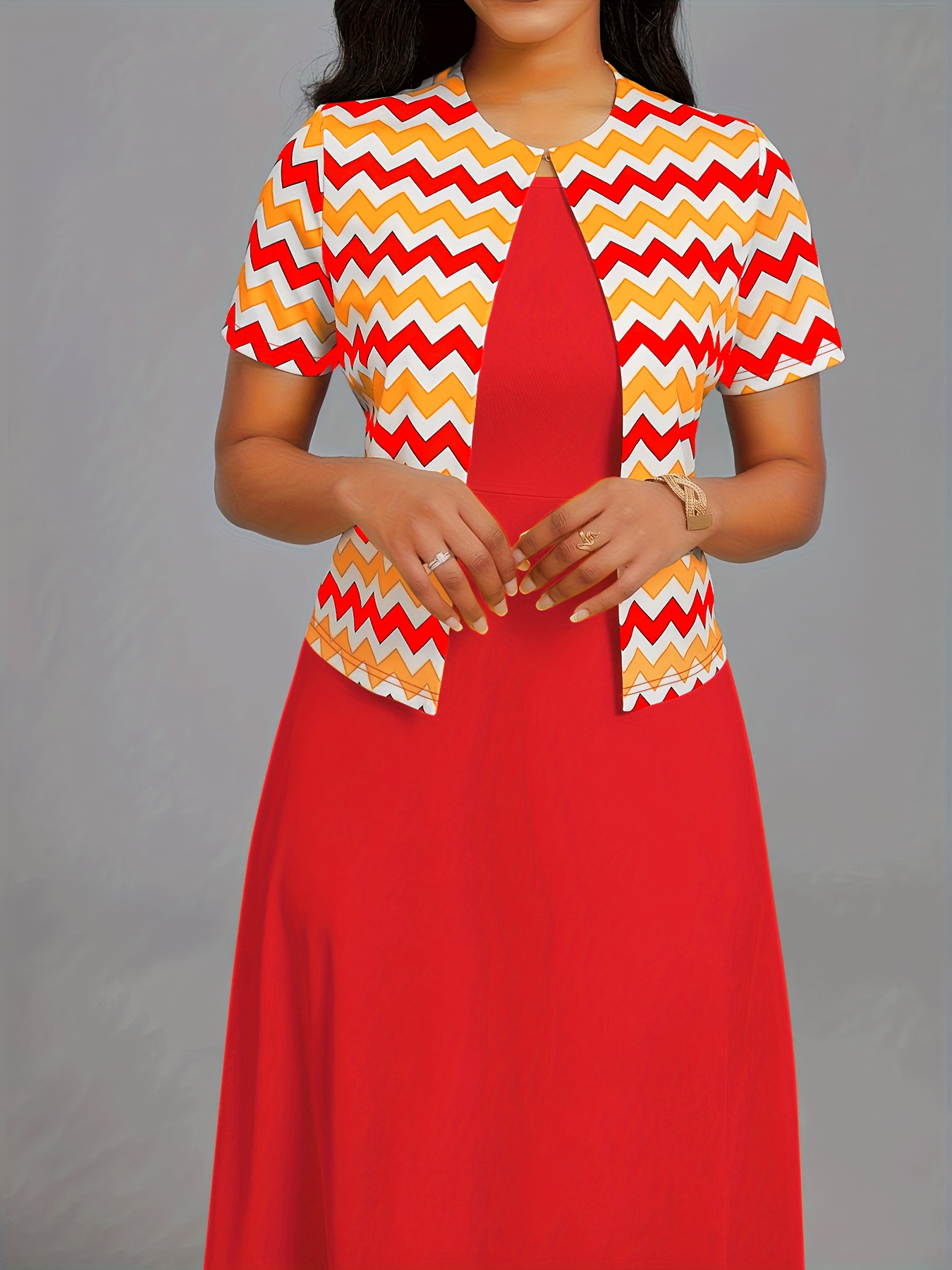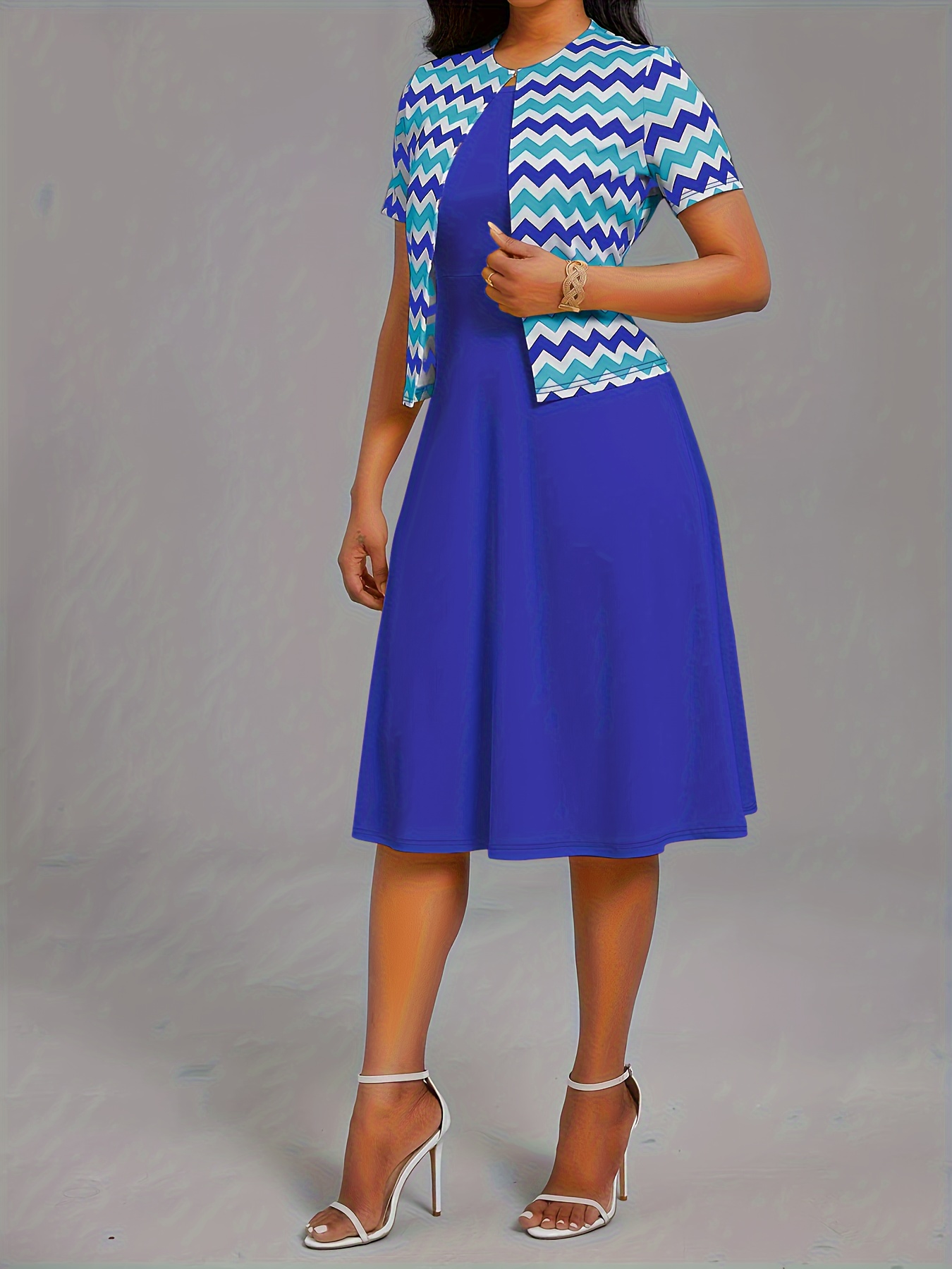 Chic Spring & Summer Dress Set - Stylish Wave Pattern Open Front Cardigan & Soft Solid Color Crew Neck Dress Outfit - Perfect for Casual Elegance