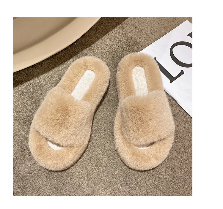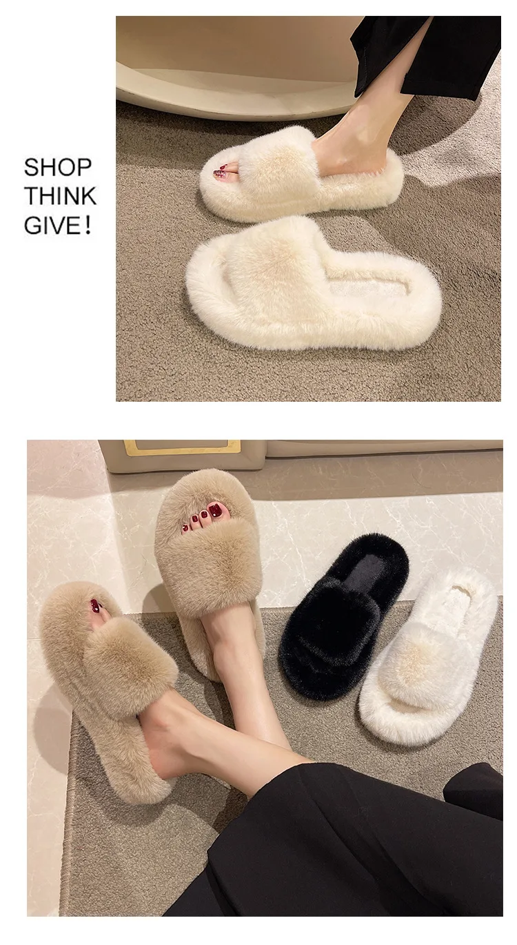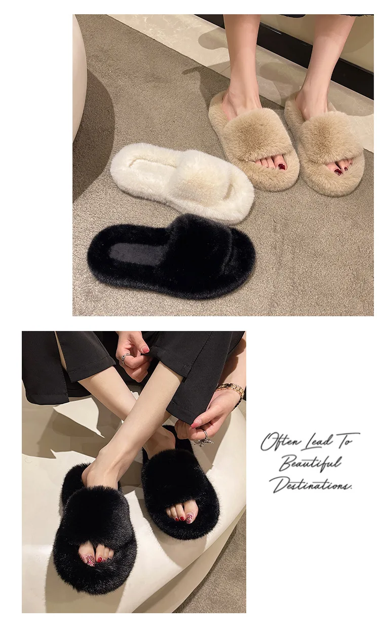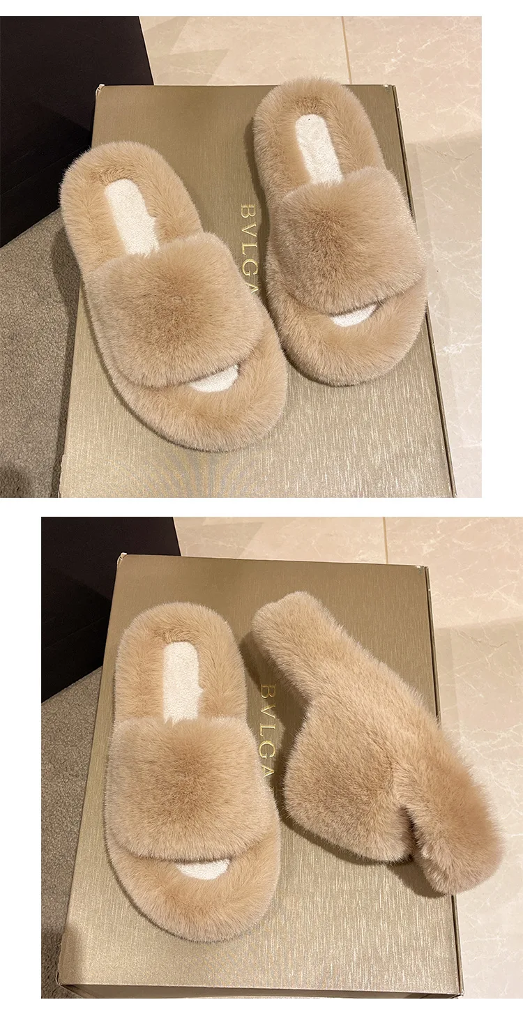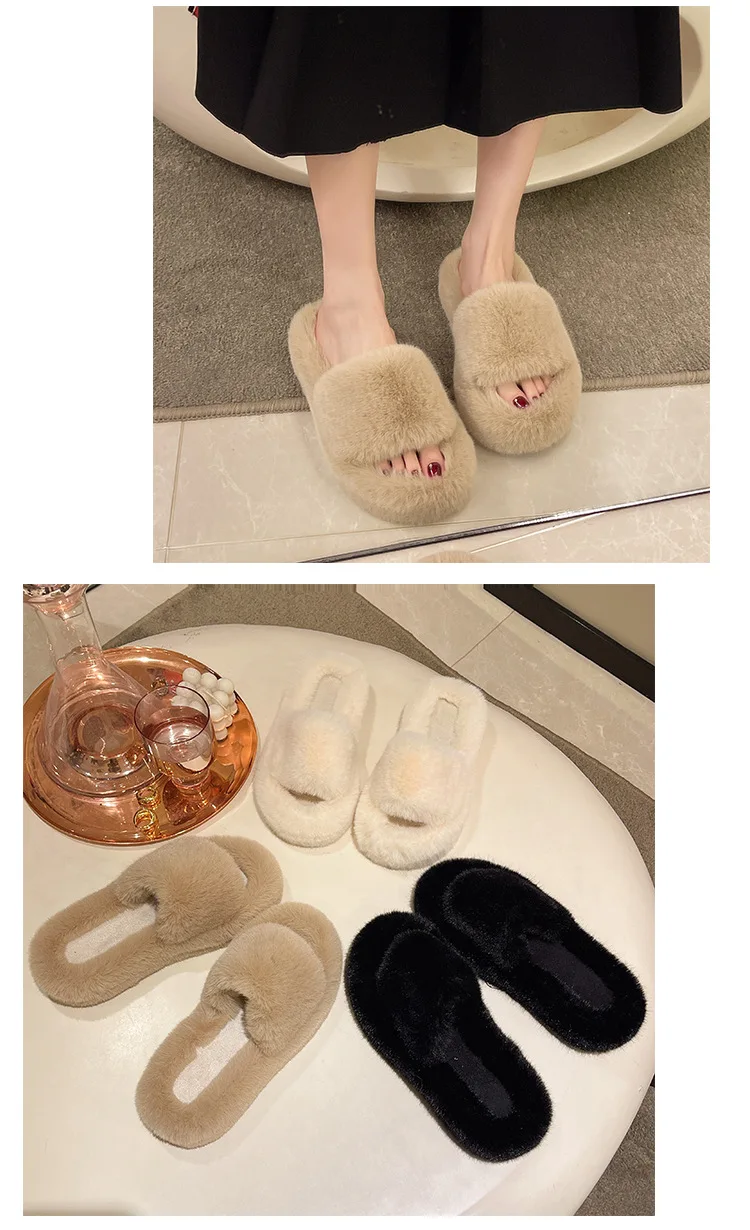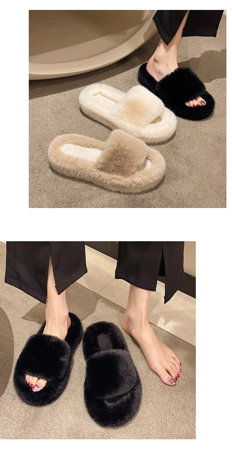 Home Slippers Women's Flat Shoes Female Lady Fur Flip Flops Slides 2023 Soft Plush Cotton Indoor Winter Zapato Mujer