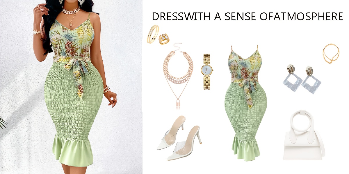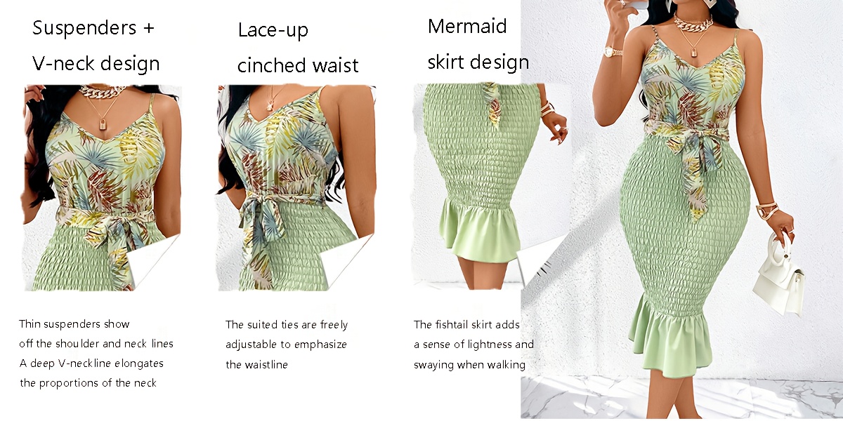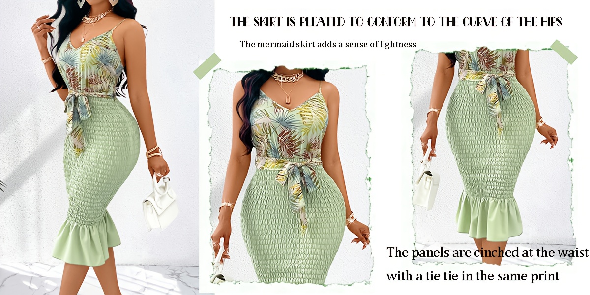 Women's Elegant Sleeveless Bodycon Dress with Thin Straps & Adjustable Waist Tie - Ruched Bust Detail, Tropical Leaf Print, Ruffled Hem, Mid-Length Summer Dress for Casual to Semi-Formal Occasions, Tight Fitted Dress, Formal